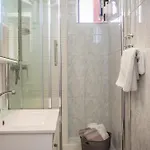 Et badeværelse med en bruser og en vask samt en hårtørrer, badehånklæder og håndklæder er til rådighed.